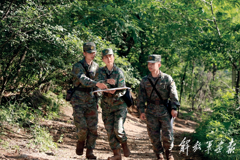 趙麗(中)與戰(zhàn)士一起進行定向越野訓練。