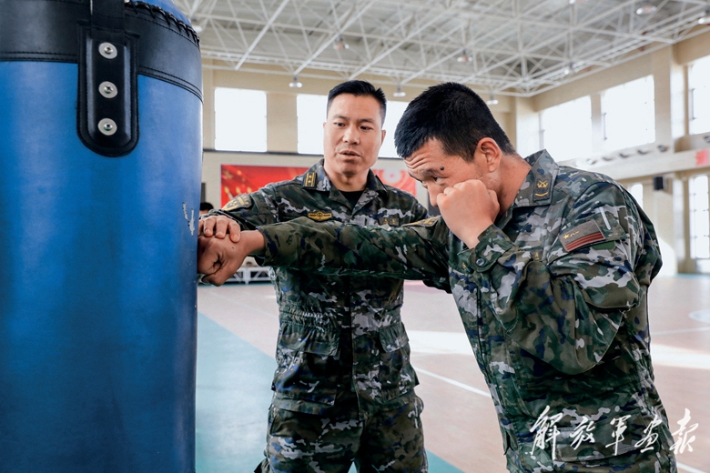 成林(后)指導戰(zhàn)士進行搏擊訓練。