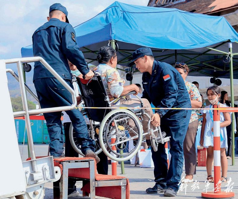 當(dāng)?shù)貢r(shí)間9月6日,訪問東帝汶期間,和平方舟醫(yī)院船官兵協(xié)助行動(dòng)不便患者上船接受治療。