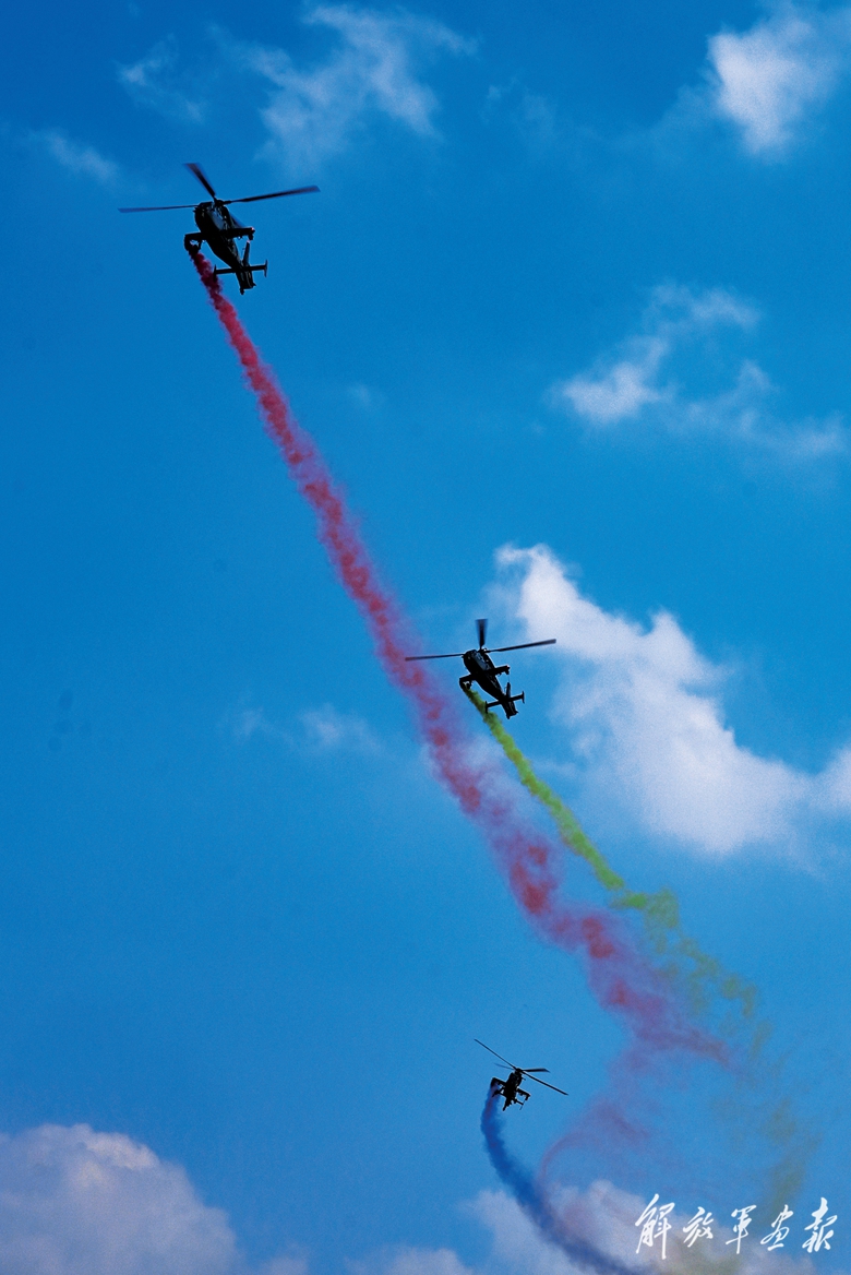 伴著螺旋槳的隆隆轟鳴聲,陸軍“風(fēng)雷”飛行表演隊(duì)隊(duì)員駕駛直升機(jī)組成“八一”字樣,在空中大速度通場,拉開第六屆中國天津國際直升機(jī)博覽會(huì)的序幕。