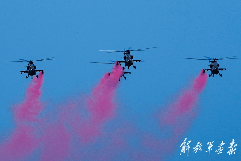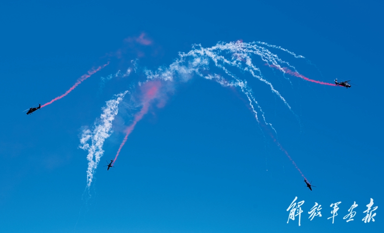 陸軍“風(fēng)雷”飛行表演隊(duì)?wèi)?zhàn)機(jī)組成“八一”字樣通場。