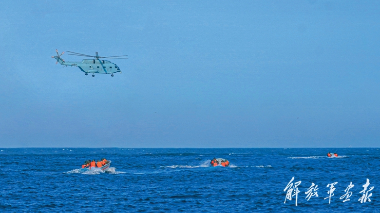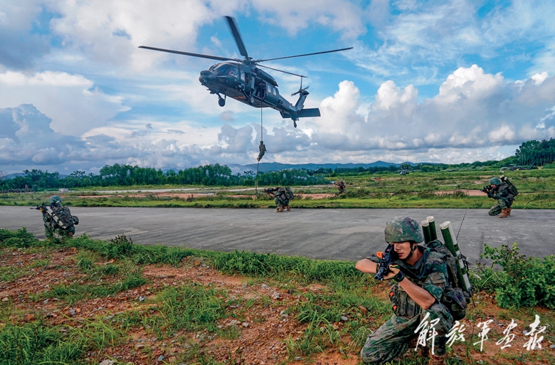 戰(zhàn)炮轟鳴,硝煙滾滾。一輪火力打擊過后,數(shù)架直升機搭載機降突擊隊員依次升空。抵達目標地域后,直升機低空懸停,官兵快速降落,向“敵”縱深偽裝抵近。水上,攻擊分隊官兵搭乘數(shù)十艘沖鋒舟快速挺進。到達預定地域后,官兵從沖鋒舟上躍出,憑借靈活的戰(zhàn)術(shù)動作,兵分多路隱蔽接“敵”。此時,地面突擊隊員完成前沿破障,采取小群多路、交替掩護等方式,向“敵”前沿發(fā)起沖擊……各路官兵密切配合、協(xié)同作戰(zhàn),一舉突破“敵”防御要點,圓滿完成任務(wù)。