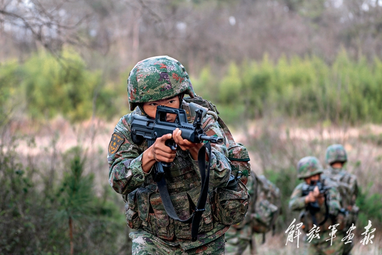 在附近的制高點上,狙擊小組密切觀察前方戰(zhàn)場情況,一面向前沿分隊通報“敵情”,一面果斷狙殺意欲偷襲的小股之“敵”。