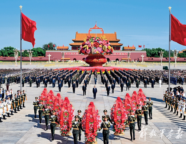 方陣前,以中共中央,全國人大常委會,國務院,全國政協(xié),中央軍委,各民主黨派、全國工商聯(lián)和無黨派愛國人士,各人民團體和各界群眾,老戰(zhàn)士、老同志和烈士親屬,中國少年先鋒隊名義敬獻的9個大型花籃一字排開,花籃紅色緞帶上書寫的“人民英雄永垂不朽”格外醒目。