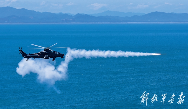 茫茫大海,水天一色。抵近目標空域后,兩架武裝直升機隱蔽增速前出,仔細搜索目標。