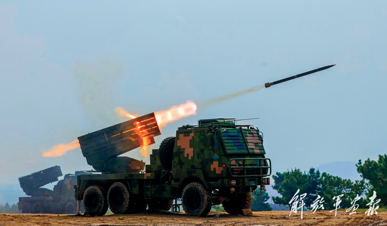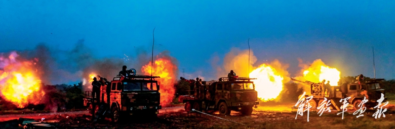 綜合研判前方回傳信息后,指揮員果斷定下戰(zhàn)斗決心。一聲令下,一枚枚火箭彈騰空而起,對(duì)目標(biāo)區(qū)域?qū)嵤┗鹆Ω采w。