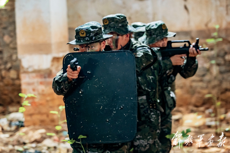 官兵們交替掩護(hù)、迂回抵近,將“暴恐分子”圍困在山腳灌木叢中。根據(jù)現(xiàn)場(chǎng)情況,指揮員迅速研判,調(diào)整作戰(zhàn)計(jì)劃,命令一組官兵佯裝攻擊,二組官兵伺機(jī)實(shí)施抓捕。各組官兵密切協(xié)作,借助火力掩護(hù),從多點(diǎn)展開攻擊,一舉將“敵”殲滅。
