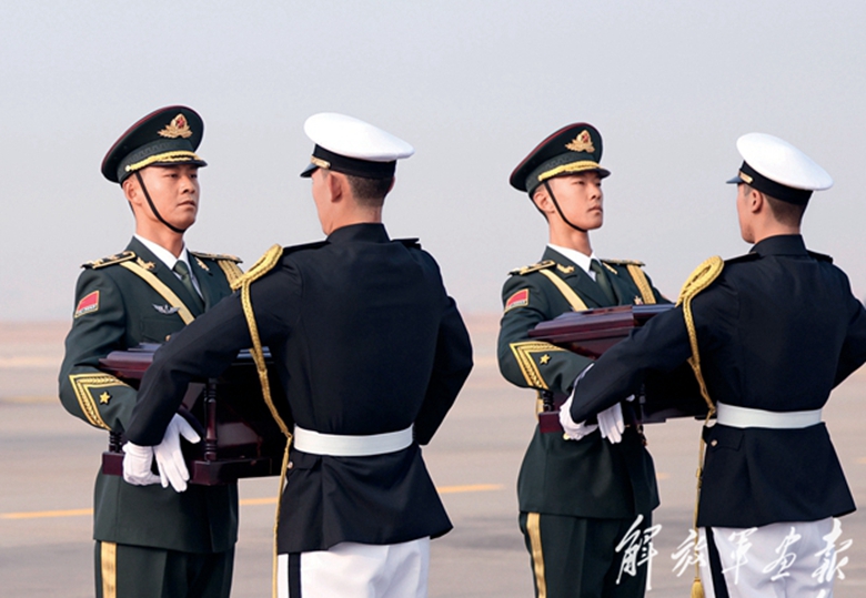 為了迎接長眠他鄉(xiāng)的英雄回家,國家每一次都舉行隆重的儀式。當護送志愿軍烈士遺骸的飛機進入中國領空后,兩架戰(zhàn)機騰空而起,伴飛護航,向志愿軍烈士致以崇高敬意。