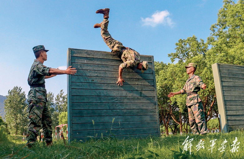 排長(右二)為戰(zhàn)士講解通過障礙技巧。