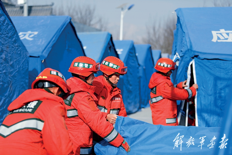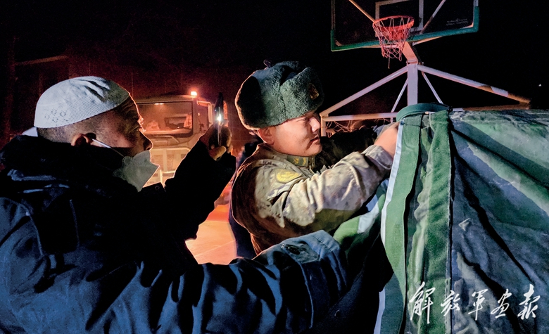 12月19日晚,陸軍第76集團軍某旅官兵在積石山縣柳溝鄉(xiāng)袁家村為受災群眾搭建帳篷。(攝影/苗國智)