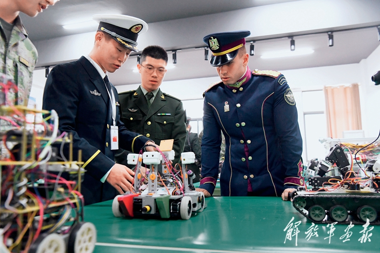中方學(xué)員在陸軍工程大學(xué)機器人俱樂部為外軍學(xué)員講解機器人性能。(攝影/李勛埔)