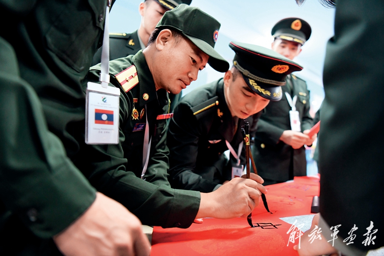 在中華傳統(tǒng)文化體驗活動中,外軍學(xué)員學(xué)寫毛筆字。(攝影/李勛埔)