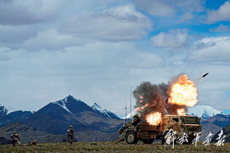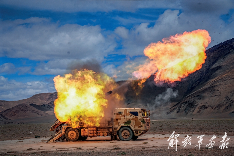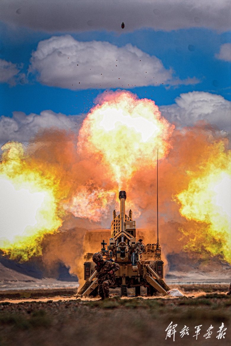 “放!”第一波次火力打擊指令下達(dá),各炮炮長果斷按下發(fā)射按鈕,數(shù)枚炮彈齊發(fā),陣地上剎那間火光沖天、塵土飛揚(yáng)。