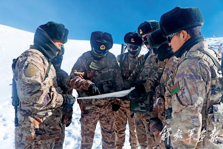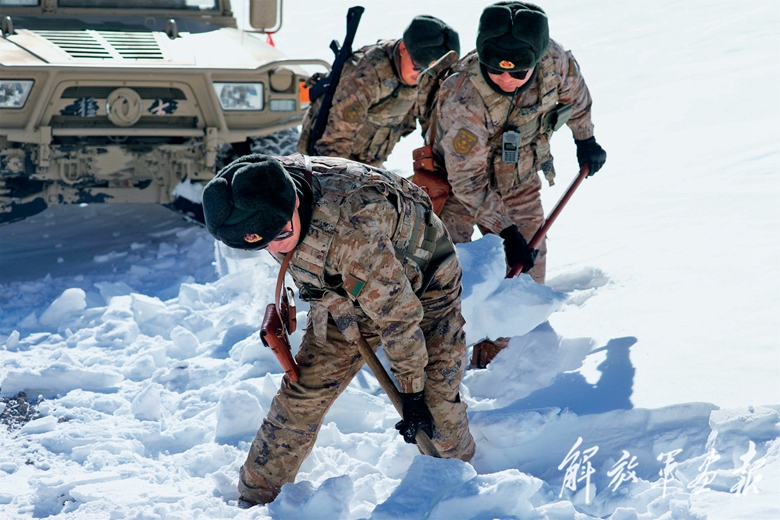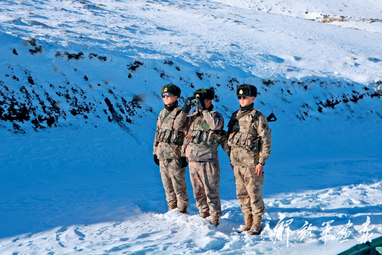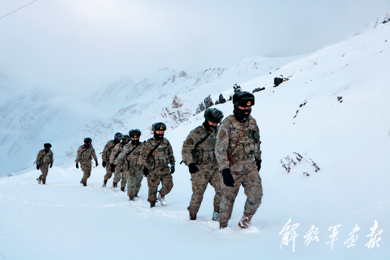巡邏路布滿冰雪,官兵艱難行進(jìn)。
