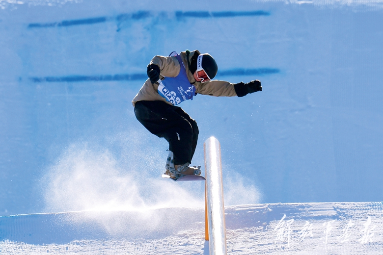 2月24日,第十四屆全國冬季運動會單板滑雪公開組男子坡面障礙技巧決賽在扎蘭屯金龍山滑雪場舉行。圖為山西隊選手蘇翊鳴在比賽中。