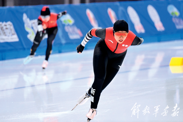 2月25日,第十四屆全國冬季運動會速度滑冰項目青年組女子1500米A組決賽在內(nèi)蒙古冰上運動訓(xùn)練中心速滑館舉行。圖為新疆隊鄧天馨(右)在比賽中。