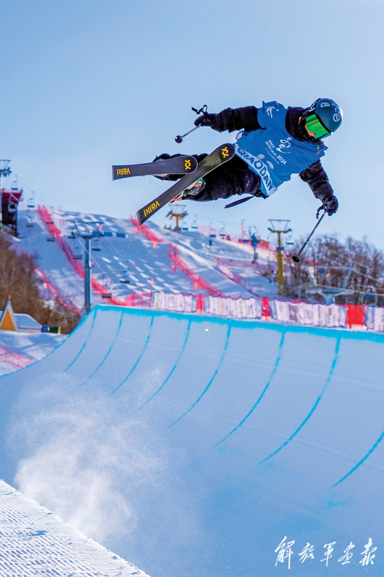 2月24日,第十四屆全國冬季運動會自由式滑雪公開組男子U型場地預(yù)賽在扎蘭屯金龍山滑雪場舉行。圖為四川隊選手黃志豪在比賽中。