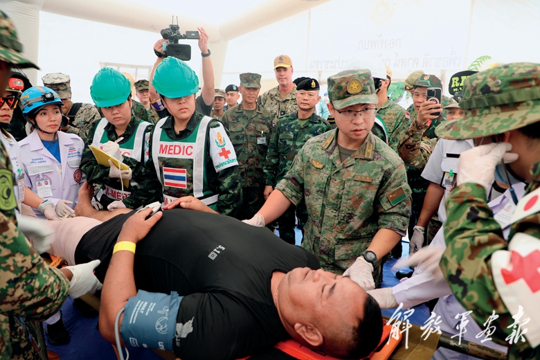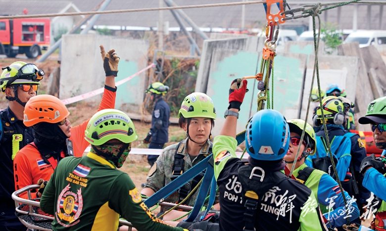 2月25日至28日,人道主義救援減災(zāi)實(shí)兵演練中,中方參演分隊(duì)完成了行動(dòng)協(xié)調(diào)、人員搜救、水上救援、火災(zāi)救援、化學(xué)泄漏處置和醫(yī)療急救6個(gè)演練內(nèi)容。演練中,中方水上救援組與美國、韓國參演人員共同編組,隊(duì)員陳浩作為組內(nèi)唯一會(huì)潛水的成員,在進(jìn)行安全評(píng)估后,第一時(shí)間潛入水下,順利找到“溺水傷員”并展開救援;中方化學(xué)泄漏處置組按照偵察、分區(qū)、泄漏物處置、洗消的步驟對(duì)化學(xué)罐體車輛事故進(jìn)行應(yīng)急處置,并在現(xiàn)場介紹行動(dòng)原則、處置流程及工作標(biāo)準(zhǔn);中方人員搜救組女隊(duì)員主動(dòng)申請(qǐng)參與高空索降,順利將“傷員”后送,展示了中國女軍人的風(fēng)采;中方醫(yī)療組與6個(gè)國家參演人員混合編組、同臺(tái)競技,對(duì)由火災(zāi)導(dǎo)致的“復(fù)合傷重癥患者”進(jìn)行了主導(dǎo)救治。