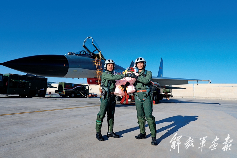 飛行學(xué)員圓滿完成三代機(jī)首次單飛訓(xùn)練后,手捧鮮花相互祝賀。