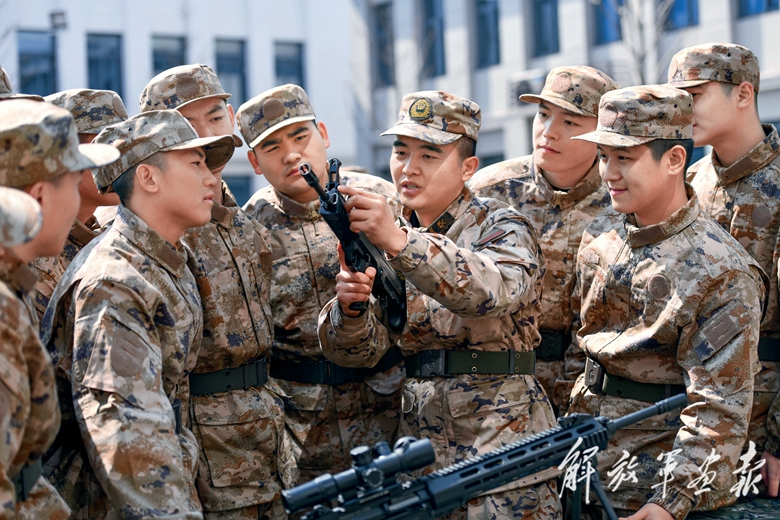 武警安徽總隊合肥支隊某部三級警士長徐偉與預(yù)定新兵分享自己的軍旅成長經(jīng)歷。