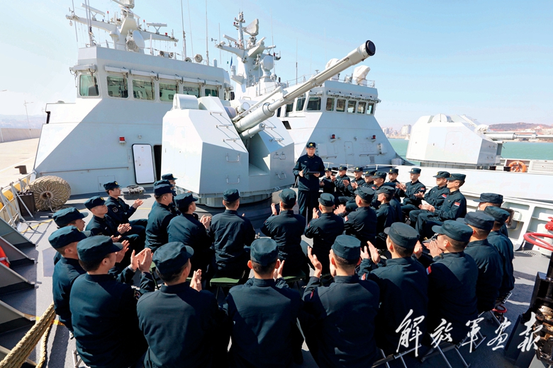 海軍東營艦組織官兵認真學習全國兩會精神并展開交流討論。 (攝影/王光杰)
