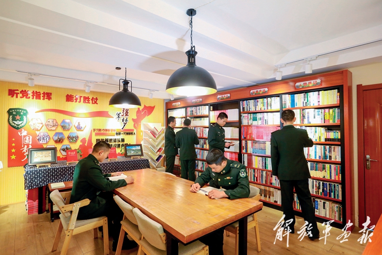 官兵們?cè)跍嘏臅葑x書學(xué)習(xí)。
