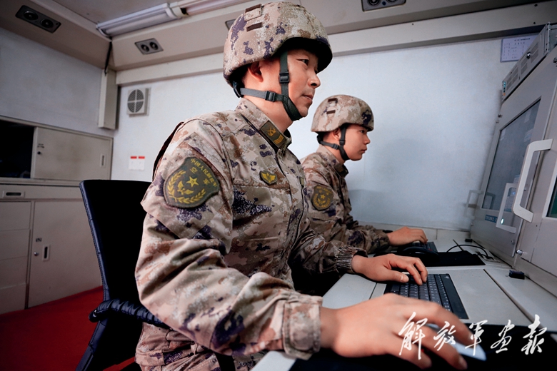 陳民華(左)在雷達(dá)方艙內(nèi)值班。