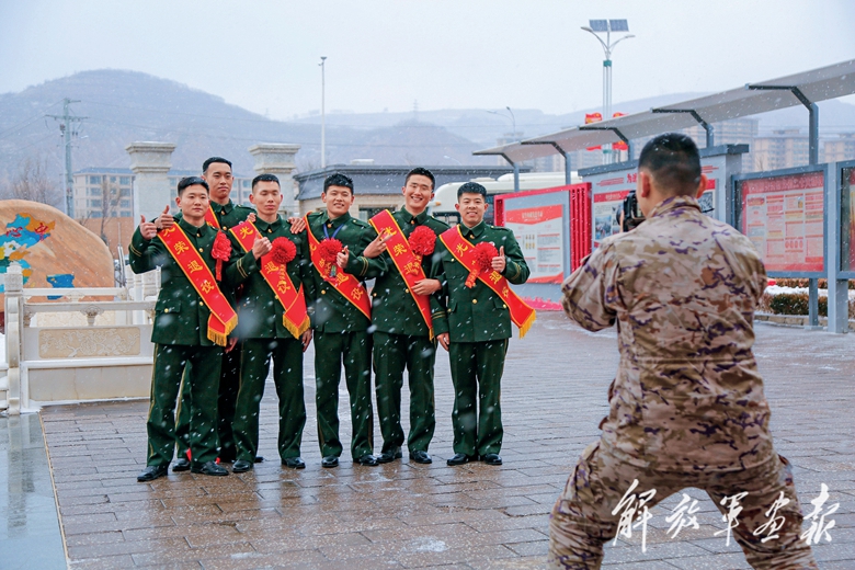 2月29日,武警甘肅總隊平?jīng)鲋ш犕艘凼勘跔I區(qū)內(nèi)合影留念。(攝影/王治國)