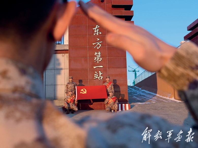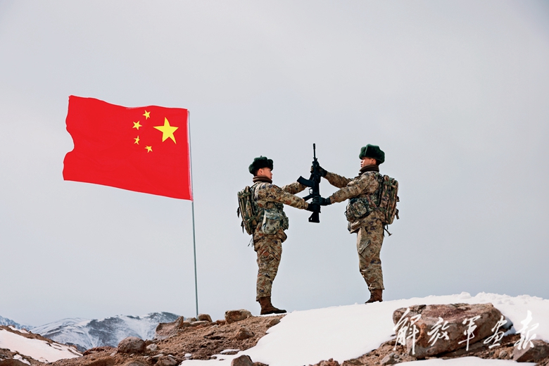 執(zhí)勤點位上,五星紅旗迎風飄揚,見證新疆軍區(qū)某邊防連退伍老兵向新兵授槍的莊重時刻。(攝影/姬文志)