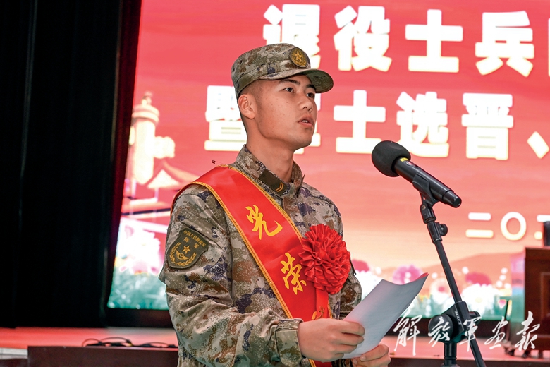 2月29日,陸軍某部優(yōu)秀退役士兵代表在臨別時發(fā)表感言。(攝影/劉志勇)