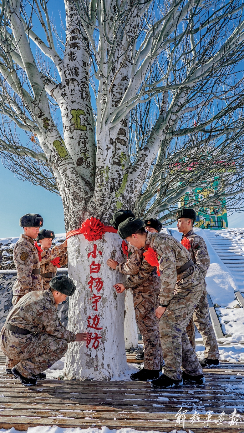 陸軍某部退役士兵結(jié)伴告別哨所的白楊樹。(攝影/李 峰)