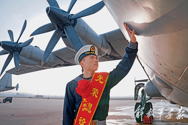 海軍航空兵某場站退役士兵撫摸戰(zhàn)鷹,向“老戰(zhàn)友”深情告別。(攝影/馬 靜)