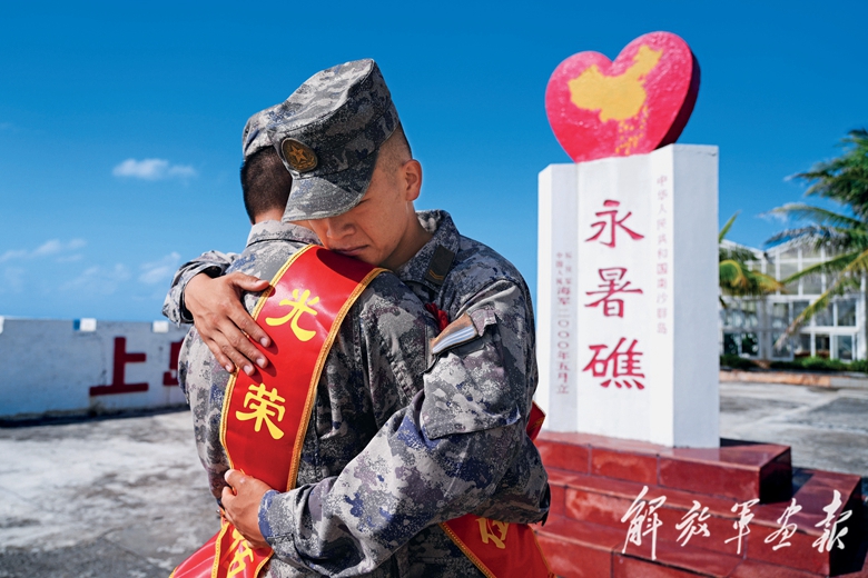 2月28日,南沙某守備部隊退役士兵與戰(zhàn)友相擁告別。(攝影/王國宏)