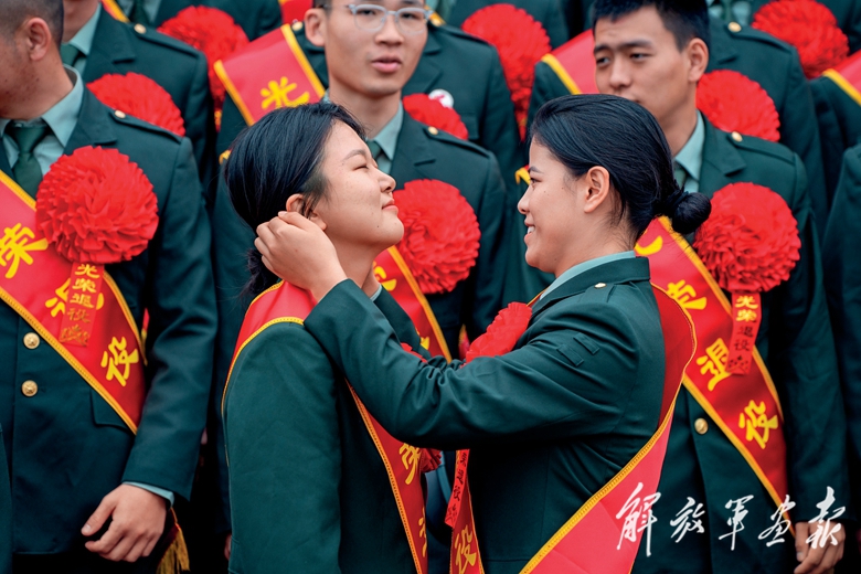 2月29日,陸軍第73集團軍某旅組織退役士兵合影留念,2名女兵互相整理儀容儀表。(攝影/彭 齊)