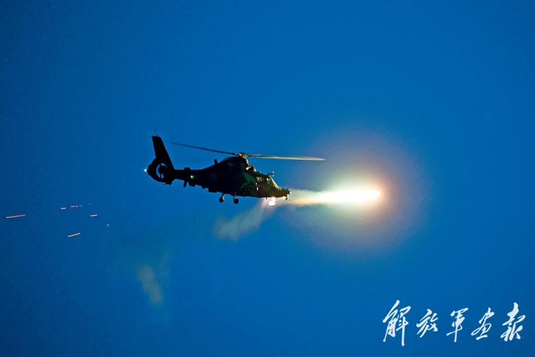 “西南方向發(fā)現(xiàn)‘?dāng)场幻黠w行物!”訓(xùn)練中,指揮組臨機(jī)導(dǎo)調(diào)。接到攻擊命令,兩架武裝直升機(jī)在空中交叉掩護(hù),低空隱蔽接近目標(biāo);占領(lǐng)攻擊陣位后,分別從不同方向鎖定目標(biāo)并實(shí)施打擊。