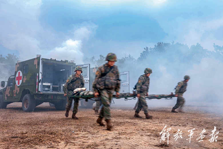 衛(wèi)勤分隊隊員進(jìn)行戰(zhàn)地“傷員”緊急搶運后送課目演練。