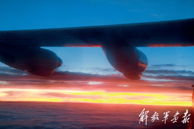 戰(zhàn)機迎著夕陽余暉飛向目標(biāo)區(qū)域。