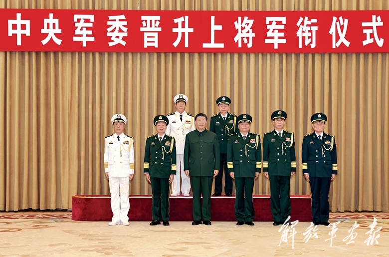 晉銜儀式在嘹亮的軍歌聲中結(jié)束。隨后,習(xí)近平等領(lǐng)導(dǎo)同志同晉升上將軍銜的軍官合影。