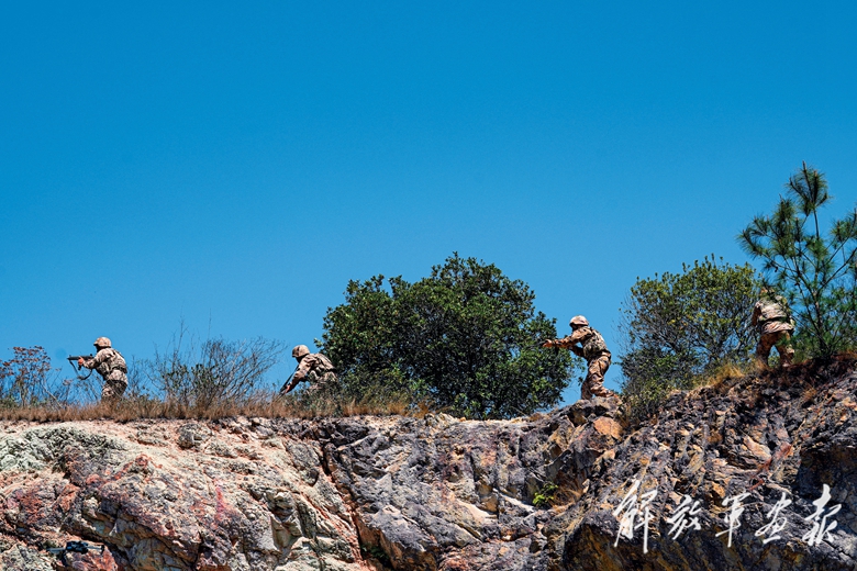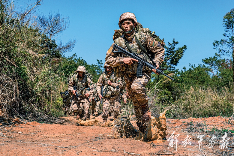 雨后初晴,道路泥濘。偵察隊員沿叢林小道前行途中,接連遭遇多個特情。抵達預定地域后,偵察小組對“敵”目標進行滲透偵察?!扒胺铰房诎l(fā)現(xiàn)‘敵’巡邏哨……”接到通報,小組長立即制訂捕俘方案,隊員們密切配合,成功處置“敵情”。