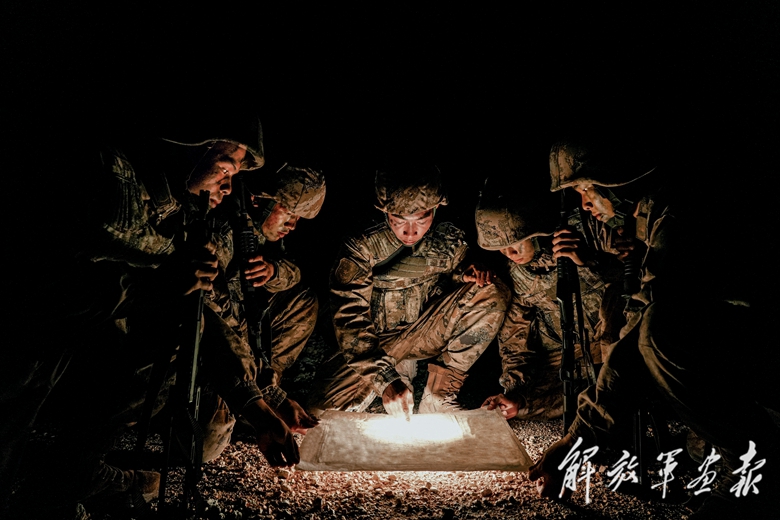 天色漸暗,各偵察小組秘密滲透、潛入“敵”后。狙擊手占領制高點進行觀察監(jiān)視,其他隊員依托有利地形,利用夜視裝備對“敵”指揮所進行抵近偵察。確認目標信息后,隊員們立即將數(shù)據(jù)回傳指揮所,引導后方力量實施火力打擊。