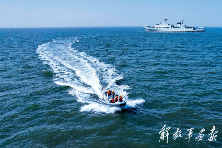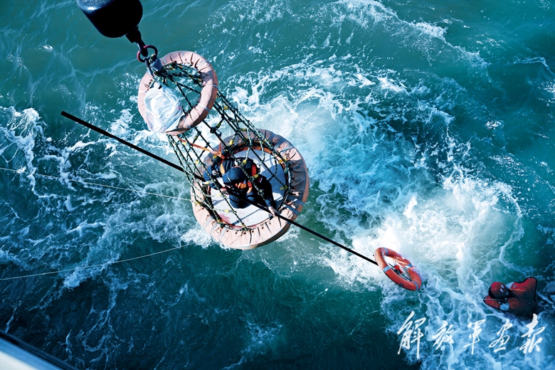 “發(fā)現(xiàn)有人員落水!”指揮員命令臨近艦艇向目標(biāo)方向加速航行。接近目標(biāo)海域后,戰(zhàn)艦吊放小艇,前出實施營救。經(jīng)過通力協(xié)作,官兵成功將“落水人員”營救上艦。