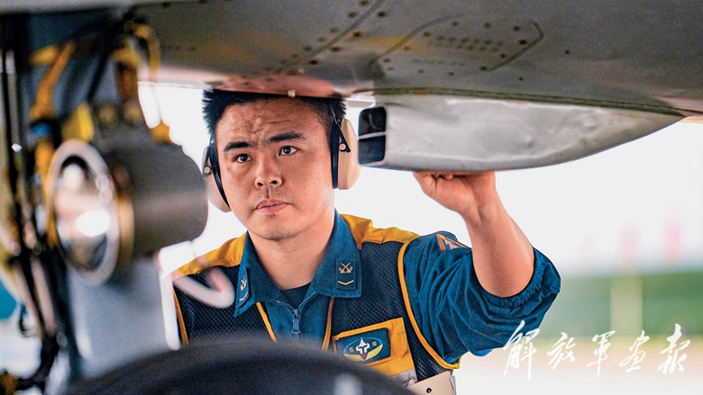 起飛前機(jī)務(wù)官兵認(rèn)真檢查戰(zhàn)機(jī)。
