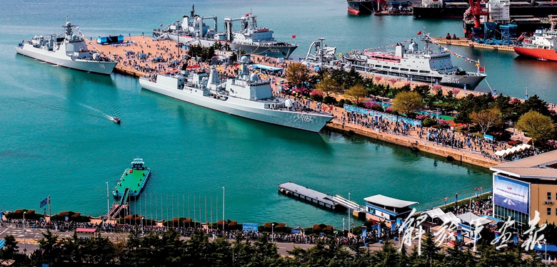 青島港3號(hào)碼頭,海軍艦艇以掛滿旗的禮儀歡迎來(lái)自全國(guó)各地的參觀者。(攝影/記者 彭 程)