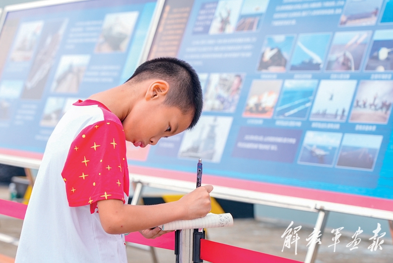 湛江某軍港組織艦艇開(kāi)放活動(dòng),一名小學(xué)生在宣傳展板前埋頭記錄海軍知識(shí)。(攝影/楊 捷)
