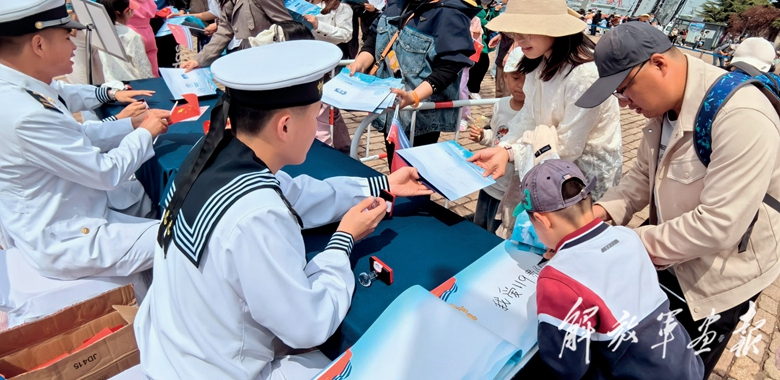 青島港3號(hào)碼頭,參觀者在貴陽(yáng)艦留言簿上留言。(攝影/記者 彭 程)