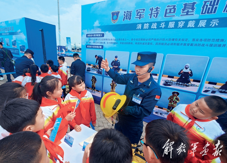 唐山艦靠泊唐山期間,官兵向小學(xué)生介紹裝具使用方法。(攝影/馬玉彬)