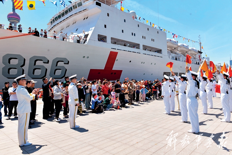 上海北外灘碼頭,官兵向參觀群眾進(jìn)行旗語(yǔ)展示。(攝影/耿海鵬)