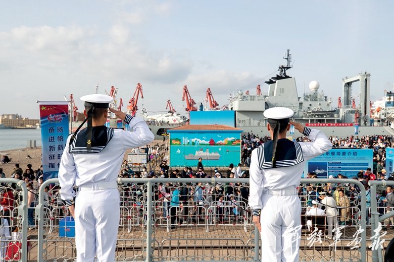 青島港3號(hào)碼頭,貴陽(yáng)艦水兵向參觀群眾敬禮致意。(攝影/記者 彭 程)