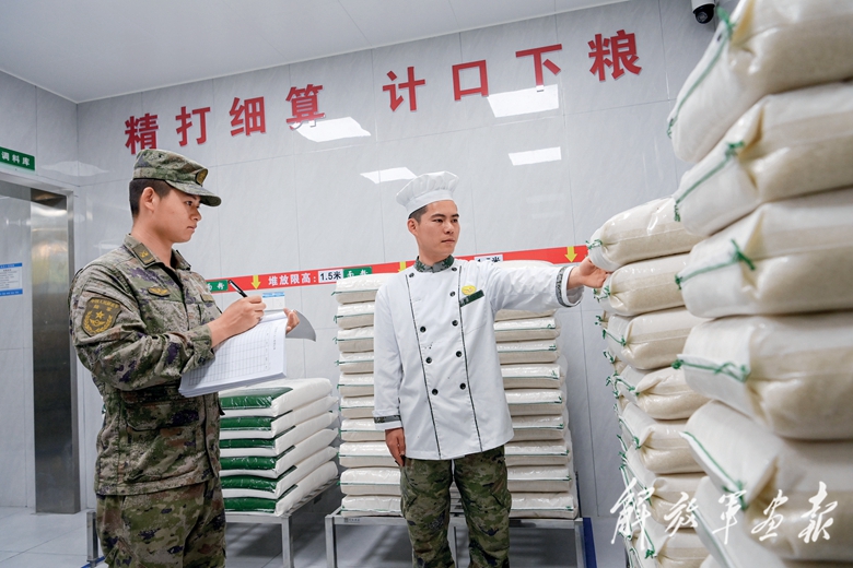 軍人委員會成員在炊事班檢查糧食購入數(shù)量。