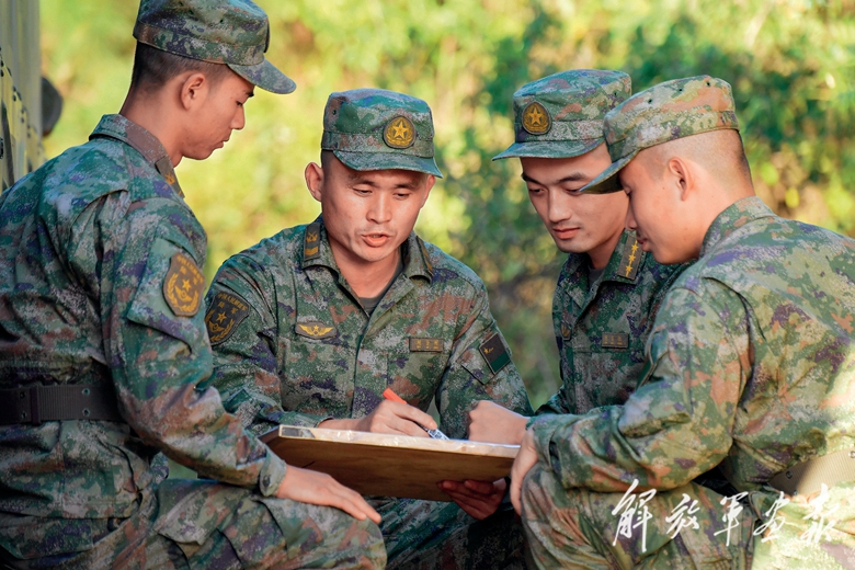 該旅某連軍士支委(左二)與官兵研究訓練方案。